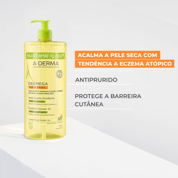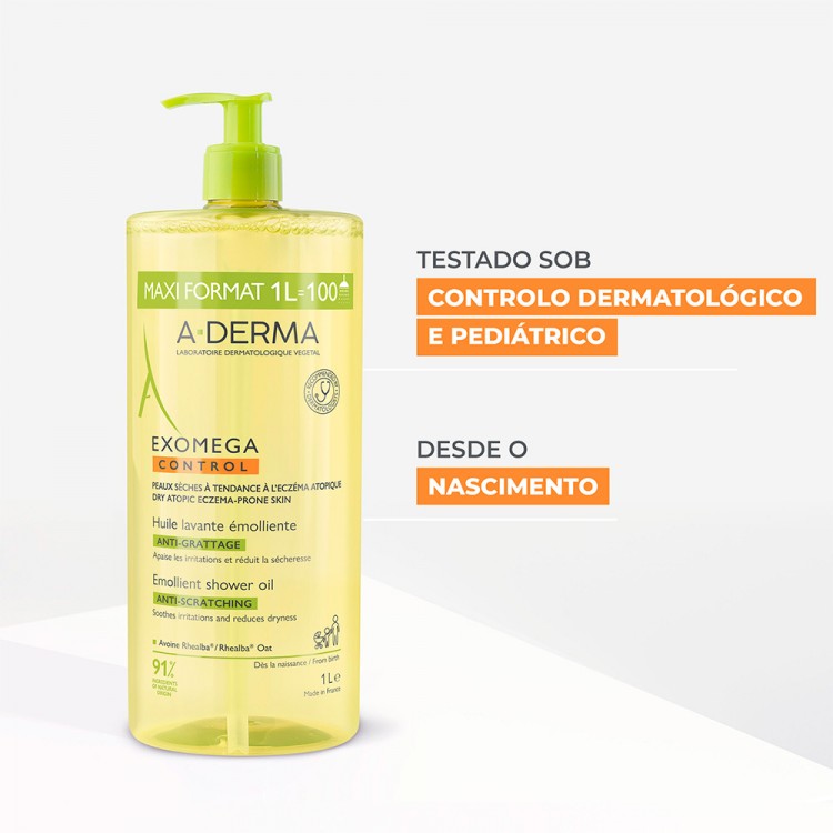 O óleo de duche emoliente Exomega Control limpa suavemente e acalma a pele seca, frágil e com tendência a eczema atópico. Formulado com 91% de ingredientes de origem natural, contém Extrato de Aveia Rhealba, reconhecida pelas suas propriedades calmantes e anti-irritantes, que conforta e protege a barreira cutânea.