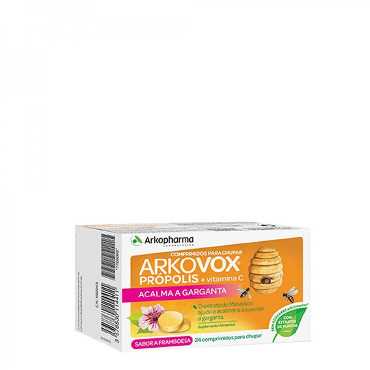 Arkovox Própolis e Vitamina C Sabor Framboesa 24 comprimidos: Arkovox® Própolis + Vitamina C sabor a framboesa é um suplemento alimentar à base de extrato de malvaísco, papaína, extrato de própolis e vitamina C. O extrato