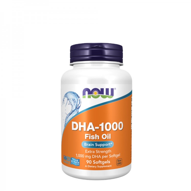 Suplemento de DHA 1000 mg da Now com óleo de peixe concentrado, ideal para apoiar a função cerebral, memória e saúde neurológica.