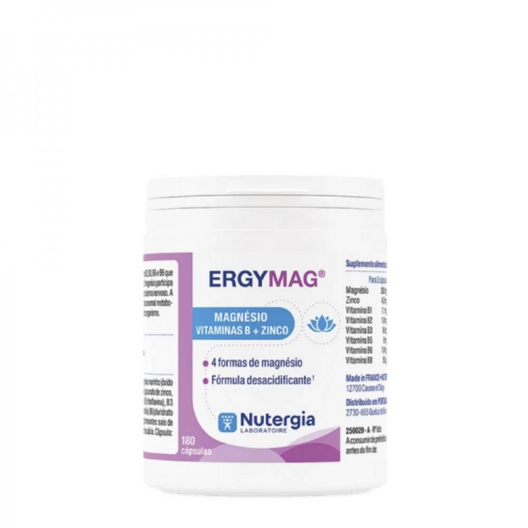 Ergymag da Nutergia é um suplemento alimentar que combina quatro sais de magnésio (citrato, bisglicinato, óxido marinho e carbonato), vitaminas do complexo B e zinco.