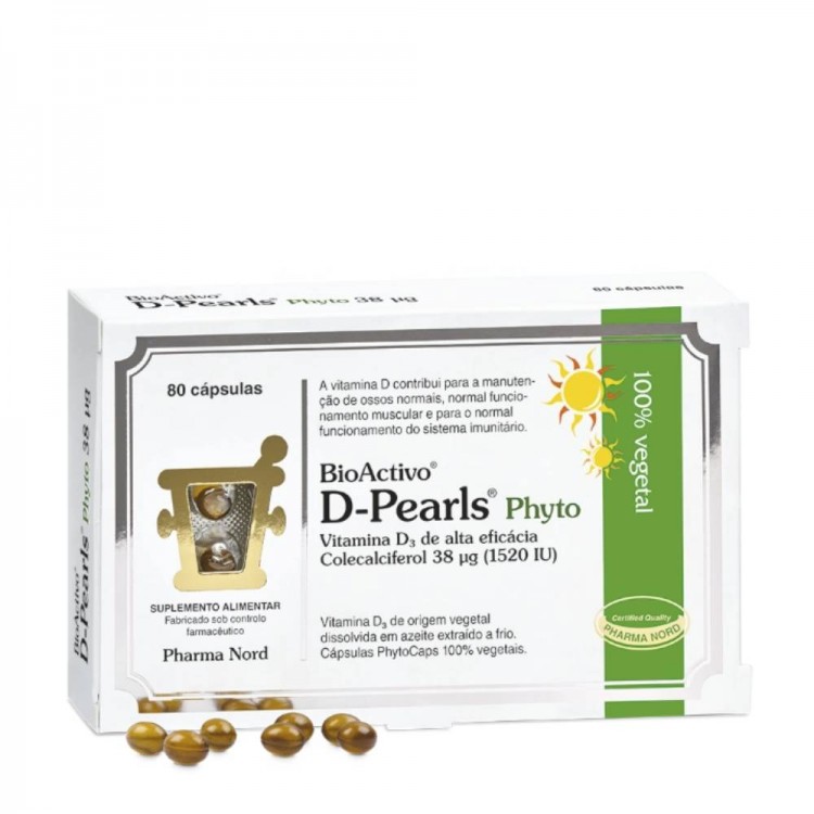 BioActivo D-Pearls Phyto são cápsulas 100% vegetais com 38µg (1520UI) de vitamina D3 extraída de algas, dissolvida em azeite prensado a frio para uma absorção ideal. As cápsulas são pequenas, fáceis de engolir ou mastigar, e formuladas com corantes naturais como o cacau magro. Adequado a vegetarianos e vegans.