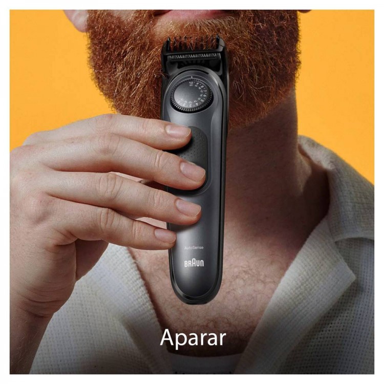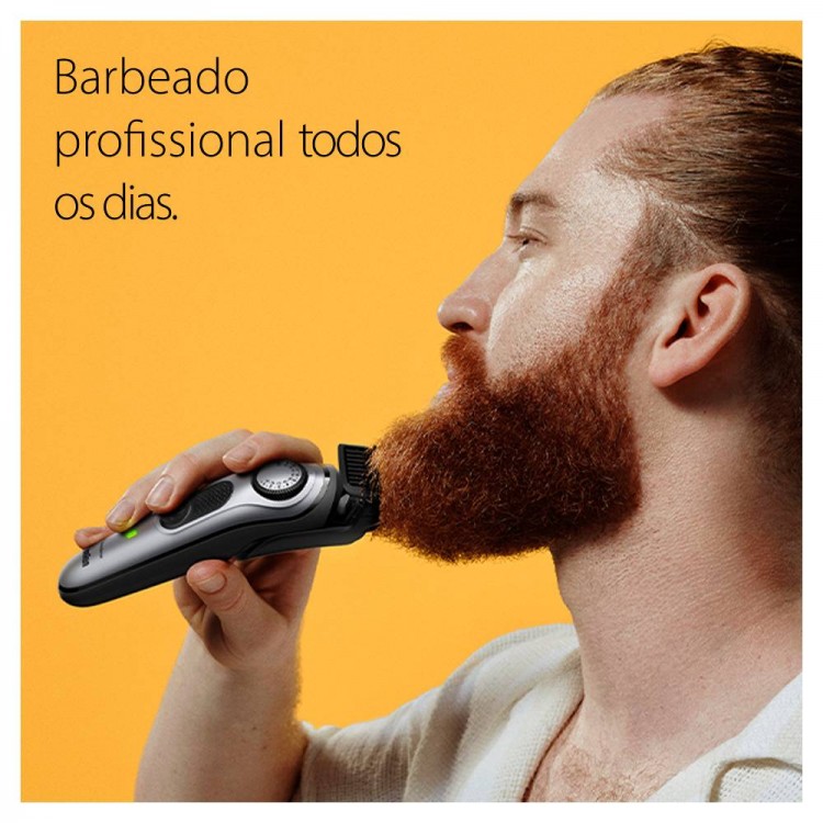 Obtenha resultados de barbeiro em casa: precisão profissional e 100% de controlo. Acabamentos ao nível de barbeiro em cada passagem: apanha até os pelos mais complicados com a ProBlade mais afiada da Braun e obtem uma uniformidade profissional em qualquer barba, graças à tecnologia AutoSense. O controlo é todo teu: seleciona entre 40 ajustes de comprimento em intervalos precisos de 0,5 mm com a Roda de Precisão. Apara detalhes com confiança em casa: os acessórios de barbeiro premium permitem criar linhas nítidas e uniformes, bem como transições suaves para acabamentos perfeitos. Feito para durar: este aparador para homem é 100% à prova de água para limpeza fácil, tem uma potente bateria Li-Ion com 100 min. de autonomia sem fios, lâminas afiadas para toda a vida, base de carregamento e mala para armazenamento na casa de banho.