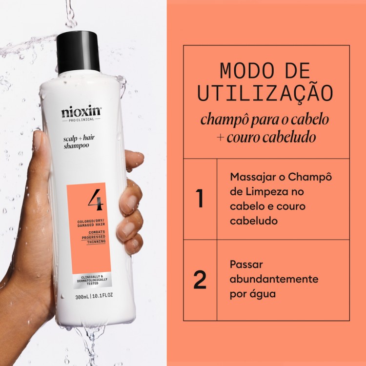 O shampoo do sistema de cuidados capilares 4 para cabelo com coloração com perda de densidade avançada é o primeiro passo de uma rotina de cuidados de três passos, especificamente formulado para fortalecer os fios de cabelo e ampliar a estrutura da fibra capilar.