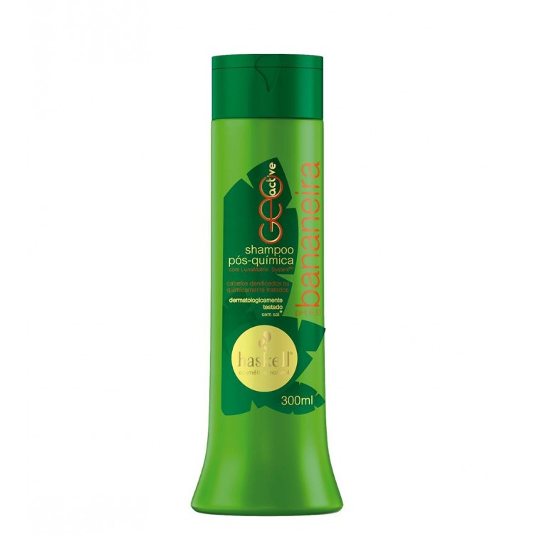 Como aplicar Haskell Bananeira Shampoo 300mlLave os cabelos com o Shampoo Pós-química Bananeira Geo Active Haskell e massage até formação de espuma abundante. Enxague em seguida. Se desejar, repita a operação.