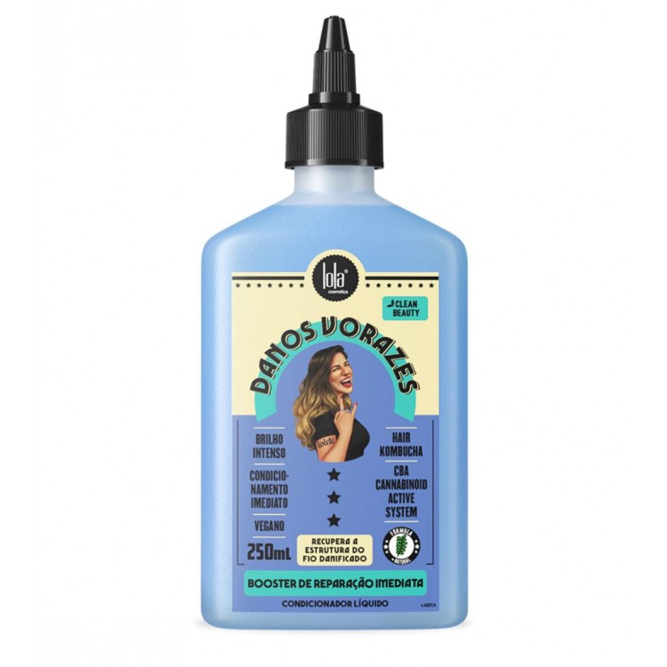 Lola Danos Vorazes Booster De Reparação Imediata é um condicionador líquido para deixar os cabelos fortes, macios, sem frizz e com brilho luminoso.