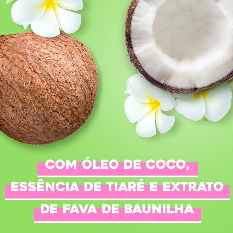 Contém óleo de coco, óleo de tiare e extrato de baunilha que ajudam a penetrar na haste do cabelo graças ao seu baixo peso molecular e alta afinidade proteica, deixando o cabelo maleável e com brilho espetacular.