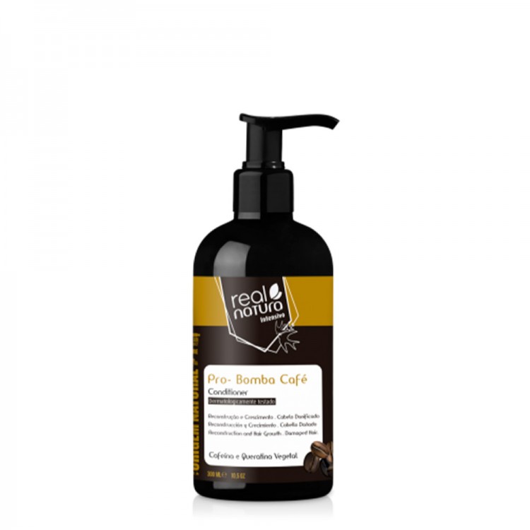 Real Natura Pro-Bomba Café Condicionador Sem Sal 300ml: revitaliza e fortalece cada fibra capilar, proporcionando crescimento acelerado, maciez e brilho intenso.
