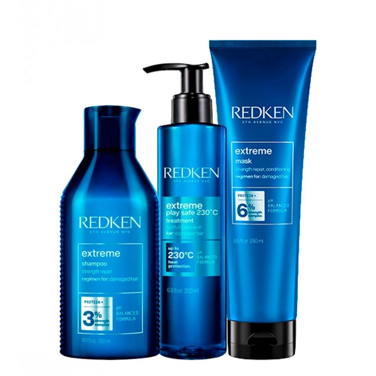 Máscara da gama Redken Extreme, formulada com 6% de complexo de força com proteína, indicada para cabelos danificados.
