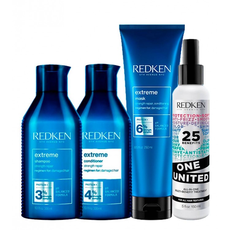 Máscara da gama Redken Extreme, formulada com 6% de complexo de força com proteína, indicada para cabelos danificados.