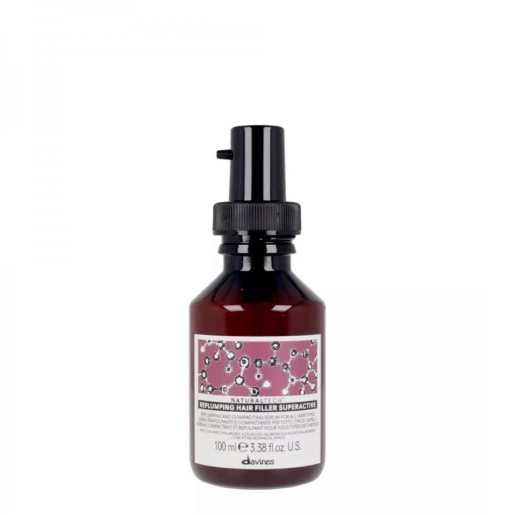 Davines Naturaltech Replumping Hair Filler Superactive é um leave-in de forte efeito cosmético. Este tratamento sem enxaguar compacta, tonifica e preenche a estrutura dos cabelos. Sem sulfatos nem parabenos. Permite que o styling se prolongue no tempo com