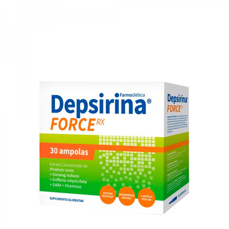 Depsirina Force RX é um suplemento alimentar em ampolas que ajuda a fortalecer o sistema nervoso e melhora o desempenho mental. A sua composição contém extratos de plantas tradicionalmente reconhecidas, a Rhodiola rosea e Ginseng indiano (Withania somnifera), GABA, e ainda as vitaminas B6, B1, Ácido Fólico e Ácido Pantoténico que, no seu conjunto, ajudam a equilibrar os níveis de serotonina, um importante neurotransmissor cerebral associado à alegria e boa disposição.