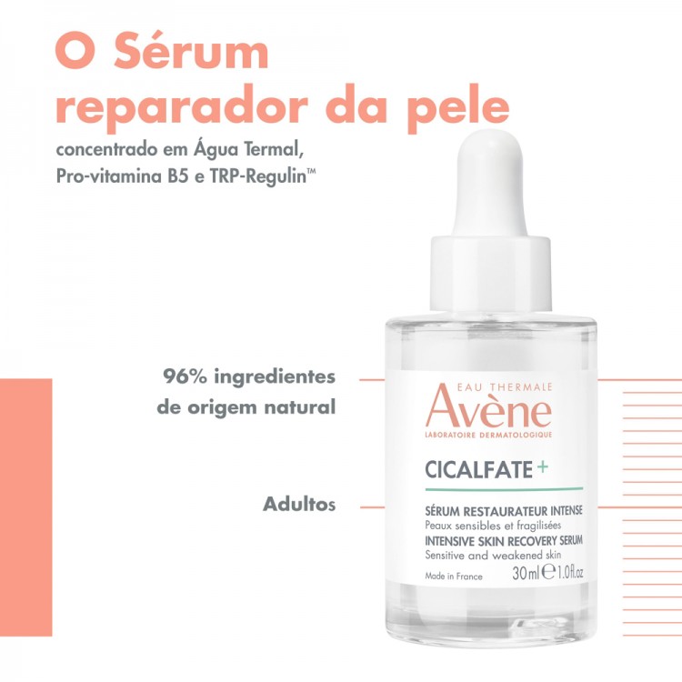 O sérum Cicalfate+ é uma resposta inovadora para reparar a pele intensamente.* Este sérum de rosto altamente concentrado em Água Termal d'Avène, Pró-vitamina B5 TRP-Regulin™, repara a barreira cutânea em 1 dia** e fortalece-a. Os mecanismos de reparação da pele são restabelecidos de forma duradoura. Proporciona um alívio imediato e duradouro da pele repuxada e desconfortável: -84% menos irritação da pele em 1 semana***.