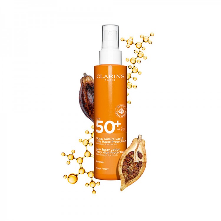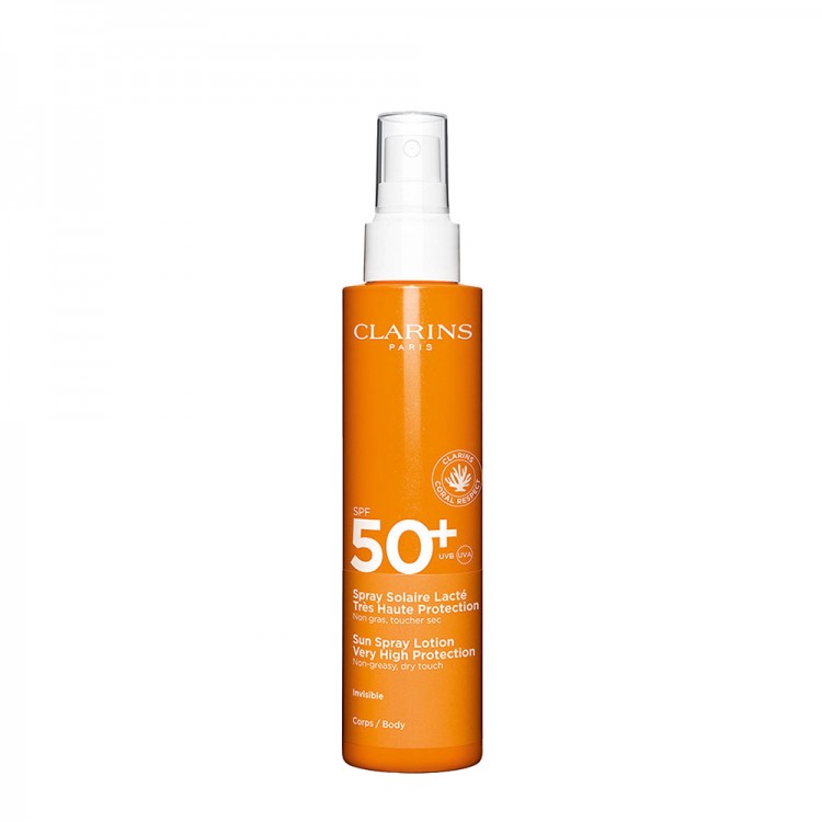 Clarins Loção Solar Alta Proteção SPF50+ 150ml: Apesar da sua leveza, o spray solar leitoso oferece uma proteção muito alta em qualquer situação.