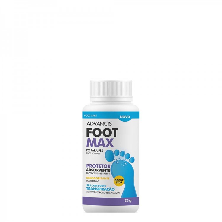 Advancis Footmax Pó para Pés foi especialmente desenvolvido para o cuidado dos pés com forte transpiração, após a higiene diária. A sua fórmula enriquecida com extrato de própolis e com óleo essencial de Tea Tree cuida e protege a pele, deixando-a perfumada e livre de maus odores.