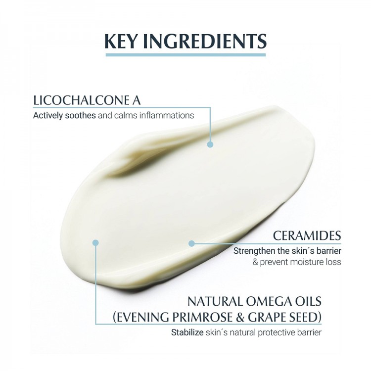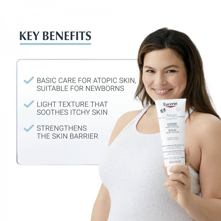 Eucerin AtopiControl Bálsamo Ligeiro é um cuidado calmante e hidratante, indicado para pele atópica e seca. A fórmula contém licochalcone A que acalma e reduz a inflamação; ceramidas com ação hidratante e que fortalece a barreira cutânea da pele; e manteiga de karité com ação nutritiva e suavizante. Acalma a pele durante as fases agudas, diminui o prurido e a secura, deixando a pele fica hidratada, suave e macia. Textura em bálsamo rapidamente absorvida. Adequado a bebés a partir dos 3 meses. Sem perfume.