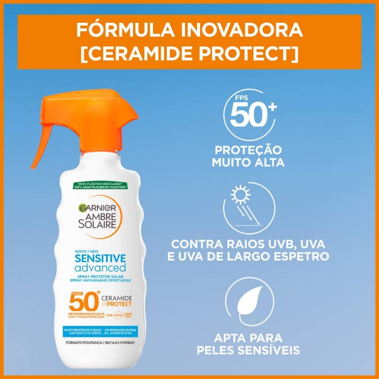 Garnier Ambre Solaire Spray Sensitive Advanced SPF50+ 270ml: Spray de proteção muito alta reforçada contra os UVB e os UVA, adaptada a pele clara, sensível e intolerante ao Sol. Constituído por uma fórmula hidratante e muito resistente à água. Formulado