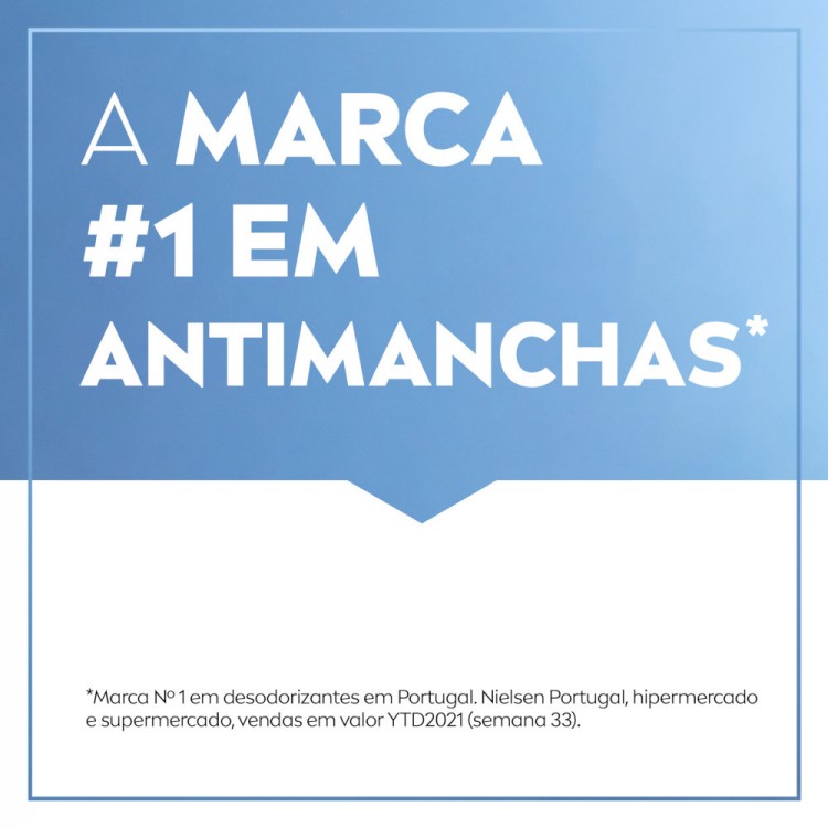DescriçãoA gama Black & White Invisible oferece proteção contra as marcas brancas na roupa preta e antimanchas amarelas na roupa branca, graças à sua tecnologia antimanchas exclusiva e patenteada.