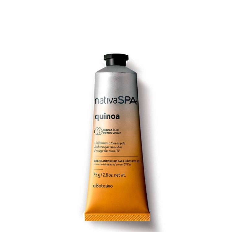O Boticário Nativa SPA Creme Hidratante Mãos Quinoa 75g Assim como o corpo, as mãos precisam de cuidado. O Creme Hidratante de Quinoa hidrata intensamente mãos com um confortável toque seco.