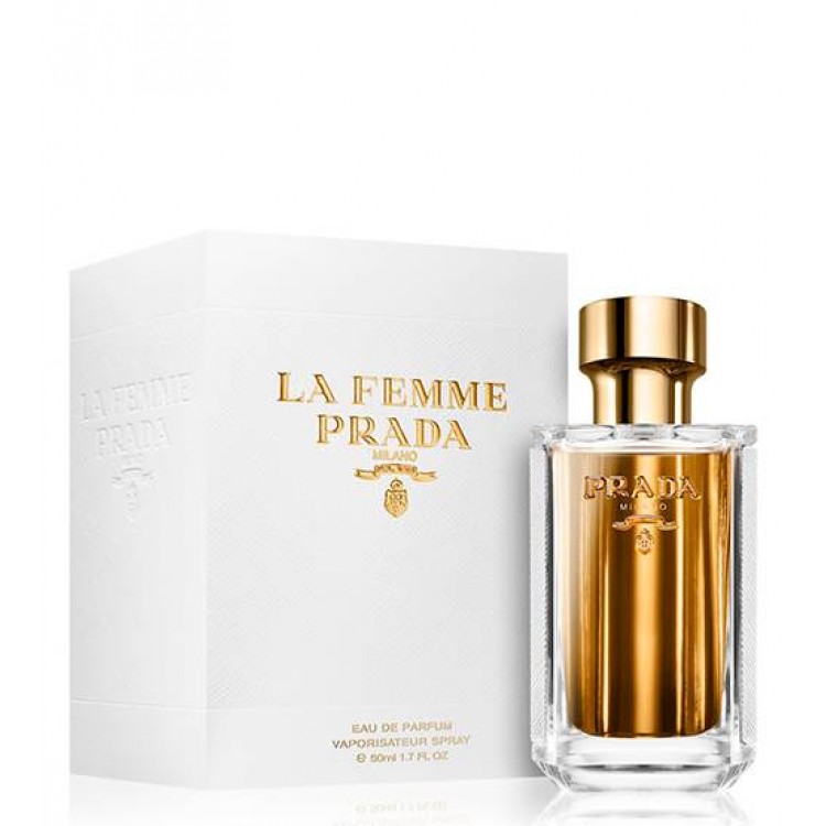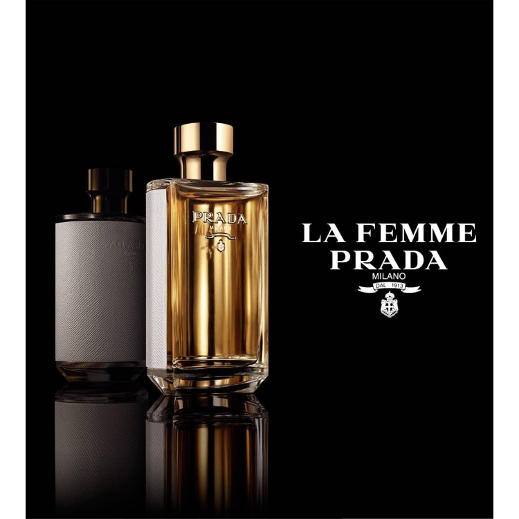 O frasco La Femme Prada veste a linguagem clássica de Prada. O icónico Prada Saffiano envolve a parte de trás do frasco, arredondada, em tons brancos. As cores branco e ouro são aplicadas na fragrância feminina, refletindo o seu perfume sofisticado, com o vidro âmbar a enfatizar esse lado exótico. O logotipo original Prada aparece gravado no vidro frontal, criando um relevo. Este design quase arquitetónico, simula o interior de uma caixa de joias Prada. É um reflexo da multiplicidade de identidades de La Femme Prada e da natureza multifacetada da própria marca Prada.