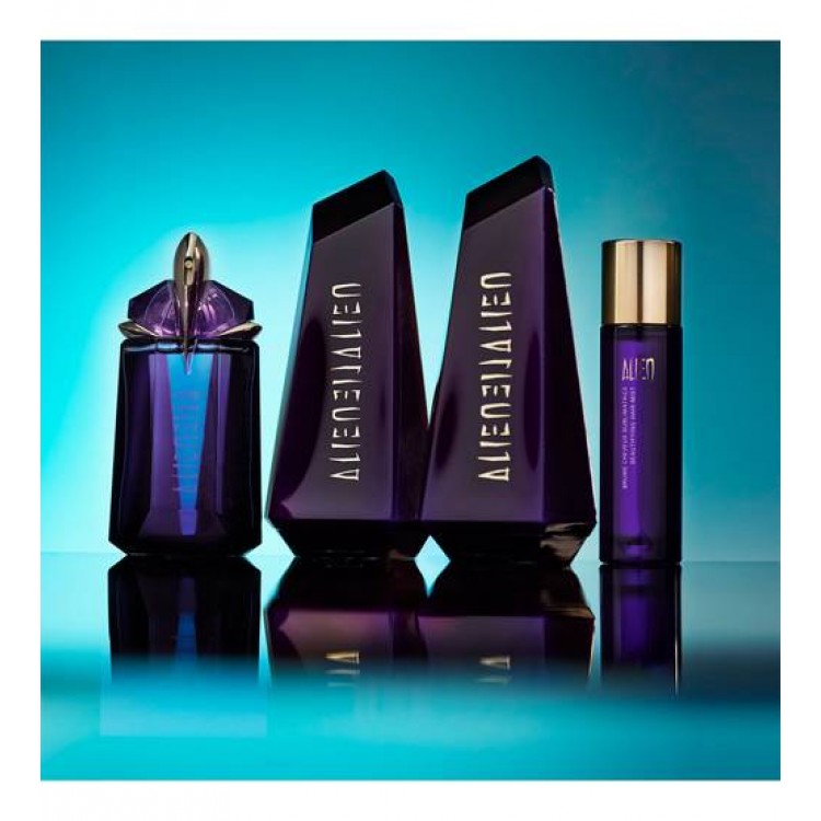 Alien Eau de Parfum: A original e única fragrância Alien. Uma criação floral e amadeirada de duas notas poderosas como caxemira e âmbar iluminados pela flor solar de jasmim árabe. A expressão olfativa de esplendor e radiação. O frasco da fragrância é como uma pedra preciosa que possui o segredo de Alien.