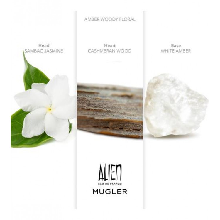 Alien Eau de Parfum: A original e única fragrância Alien. Uma criação floral e amadeirada de duas notas poderosas como caxemira e âmbar iluminados pela flor solar de jasmim árabe. A expressão olfativa de esplendor e radiação. O frasco da fragrância é como uma pedra preciosa que possui o segredo de Alien.