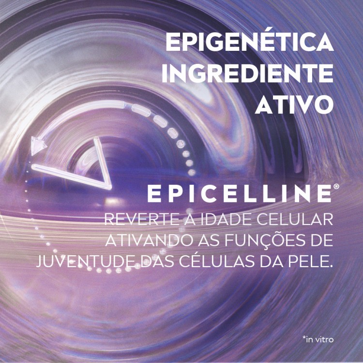 Fórmula com o ativo patenteado Epicelline que reativa os "genes da juventude" das células da pele, desativados por fatores externos.