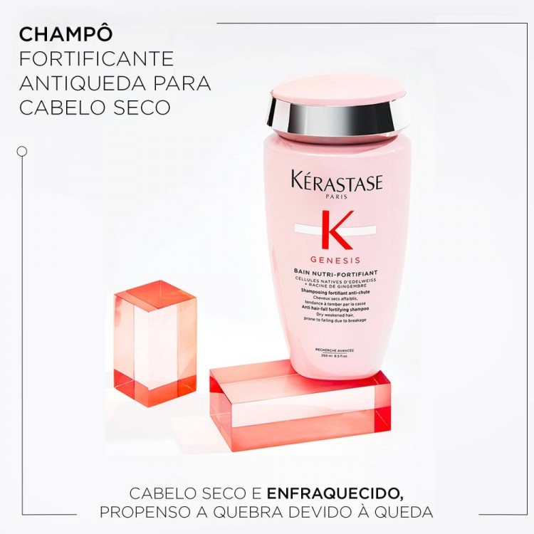 Kérastase Genesis Bain Nutri-Fortifiant limpa suavemente e reforça a fibra capilar para reduzir o risco de queda de cabelo devido à quebra.