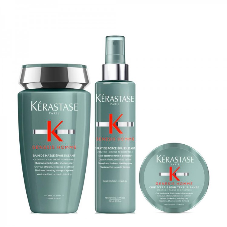 Kérastase Genesis Homme Bain de Masse 250ml + Genesis Homme Cire d'Épaisseur Texturisante 75ml + Genesis Homme Spray Récupérateur d'Épaisseur 150ml