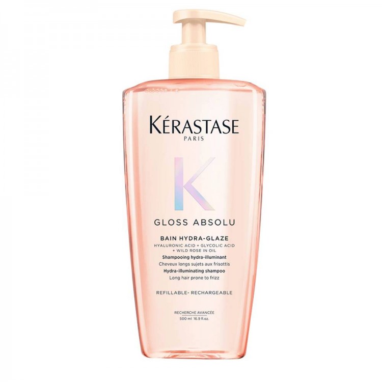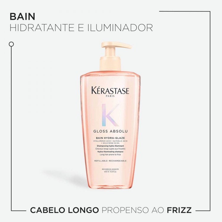 DescriçãoEntra no mundo do gloss! O Bain Hydra-Glaze de Kérastase é um shampoo para cabelo longo com tendência ao frizz. A sua fórmula, à base de ácido hialurónico, ácido glicólico e rosa silvestre em óleo, proporciona um cabelo glossy: suave, leve e brilhante.