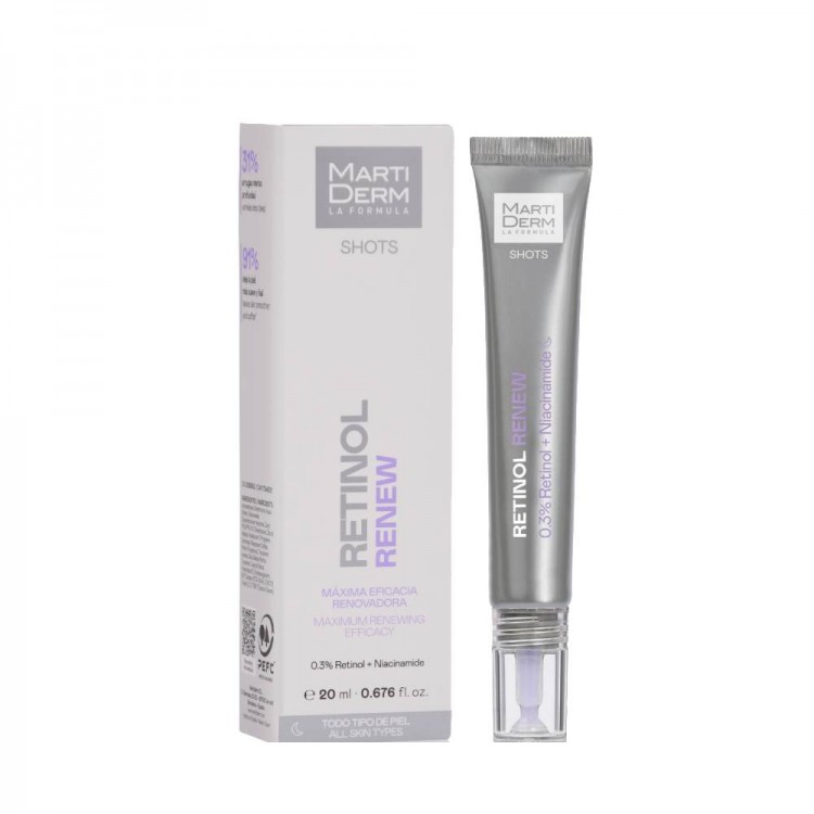 Martiderm Shot Retinol Renew é um concentrado facial intensivo baseado em Retinol e Niacinamida que fornece ao rosto uma alta capacidade de renovação para agir contra os sinais de envelhecimento.