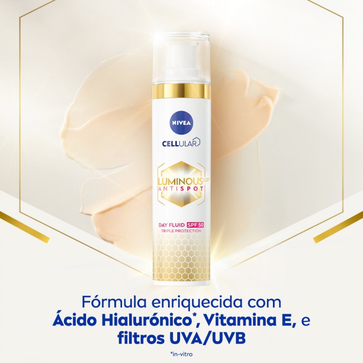 O creme de dia SPF50 Luminous 630, com ácido hialurónico, vitamina E e filtros UVA/UVB, protege a tua pele do sol e do fotoenvelhecimento, reduz as manchas e previne o seu reaparecimento. A textura leve do creme hidrata ao mesmo tempo que ajuda a controlar a olesosidade, matificando a pele. Para além disso, preenche e dá firmeza à pele, melhora a sua textura, uniformiza e ilumina a tez. Comprovado dermatologicamente e adequado a pele sensível e a mulheres grávidas.