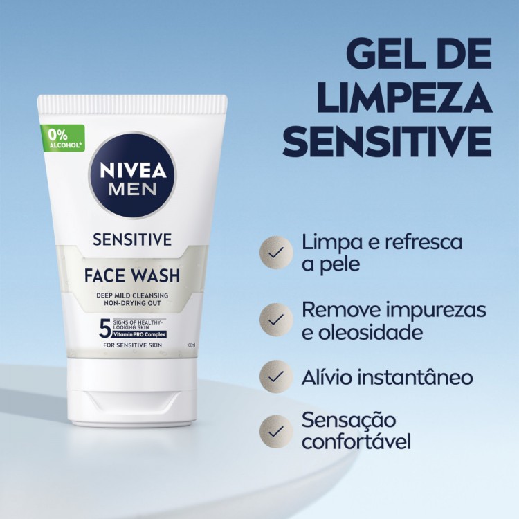 O gel de limpeza Sensitive é um gel sem sabão para homens com a pele sensível que limpa e refresca a pele. Graças à camomila e vitamina E, limpa profundamente a pele removendo as impurezas e a oleosidade. Este gel de limpeza para homem pode ser usado para desobstruir os poros, ajudando a prevenir o aparecimento de borbulhas e mantendo a pele macia. Com o uso regular deste gel de limpeza de rosto a pele sensível fica menos irritada, mais saudável e cuidada. Para além de limpar a pele, este gel também vai amolecer a barba resultando num barbear mais eficaz e confortável.