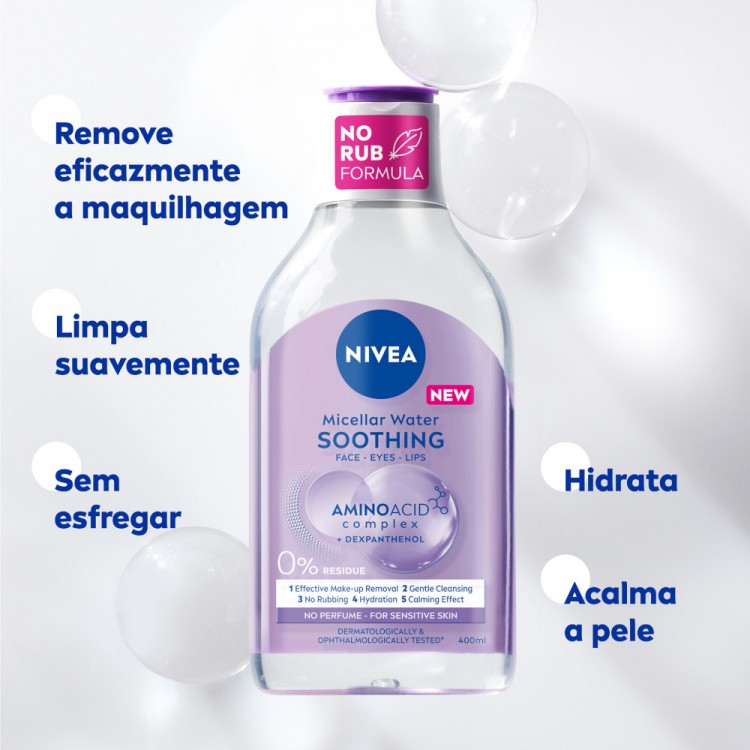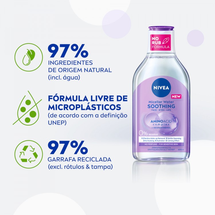 NIVEA Água Micelar MicellAIR SKIN BREATHE limpa em profundidade, remove eficazmente a maquilhagem e acalma a pele sem deixar resíduos. As micelas de origem natural funcionam como um íman que atraem a maquilhagem, partículas de pó e sebum. A sua fórmula vegan, sem ingredientes de origem animal, atua em equilíbrio com a primeira linha de defesa da pele - o microbioma. Pode ser utilizado no rosto, olhos e lábios. Sem necessidade de passar por água nem esfregar. Suave nas pestanas. Sem perfume. As embalagens são feitas de 96% de materiais reciclados - excluindo rótulos e tampa. NIVEA Água Micelar MicellAIR SKIN BREATHE, 400 ml.