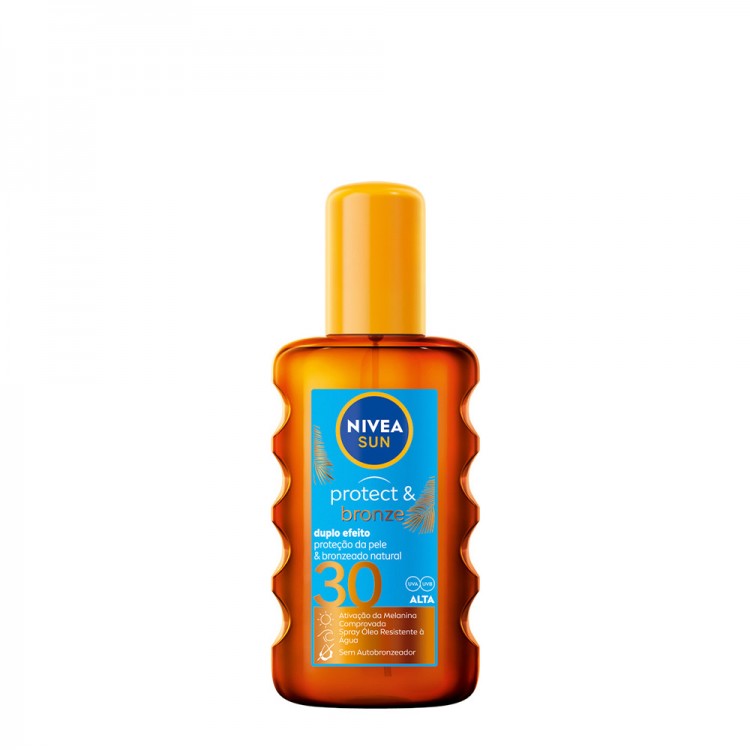 Nivea Sun Protect & Bronze Spray Óleo SPF30 200ml: proporciona um duplo efeito: proteção UV imediata da pele e bronzeado natural graças ao extrato pro-melanina que estimula a melanina da própria pele.