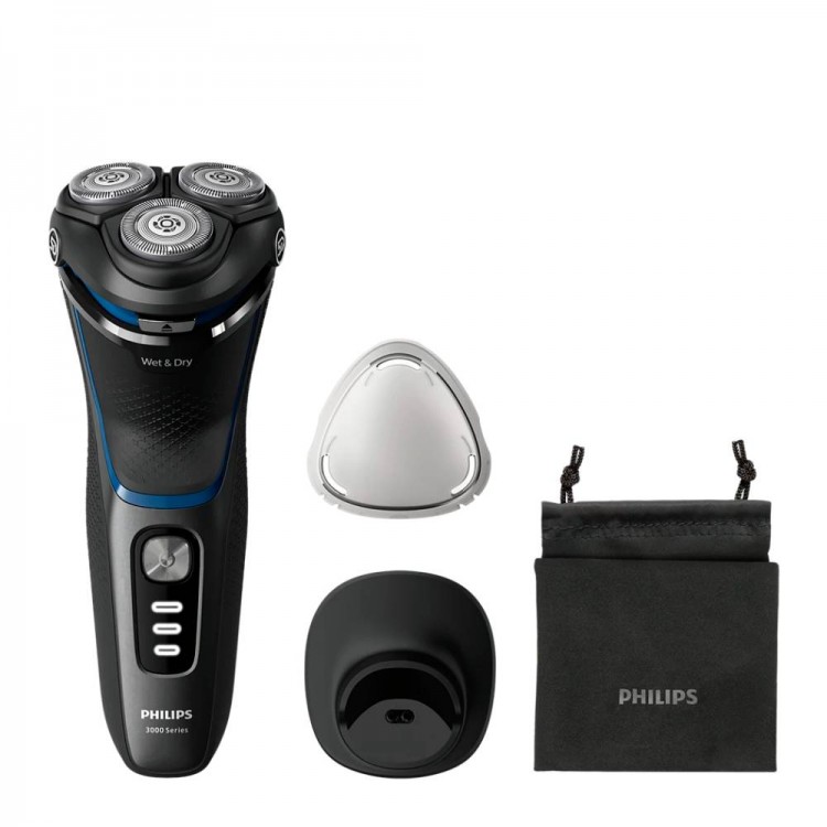 A máquina de barbear eléctrica 3000 Series Wet & Dry proporciona um barbear confortável e limpo, mesmo em peles sensíveis.