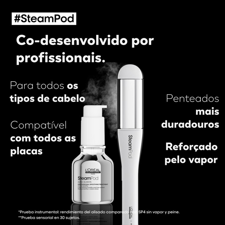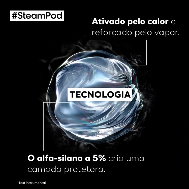 O tratamento profissional SteamPod 3 em 1, é o primeiro concentrado termo-protetor, patenteado por L'Oréal Professionnel. Desenvolvido sem água e enriquecido com alfa-silano, um ativo protetor contra o calor e as condições extremas de humidade. Ativada pelo calor e potencializada pelo vapor, a molécula alfa-silano cria uma camada protetora ao redor da fibra capilar, que resiste até 5 lavagens*.
