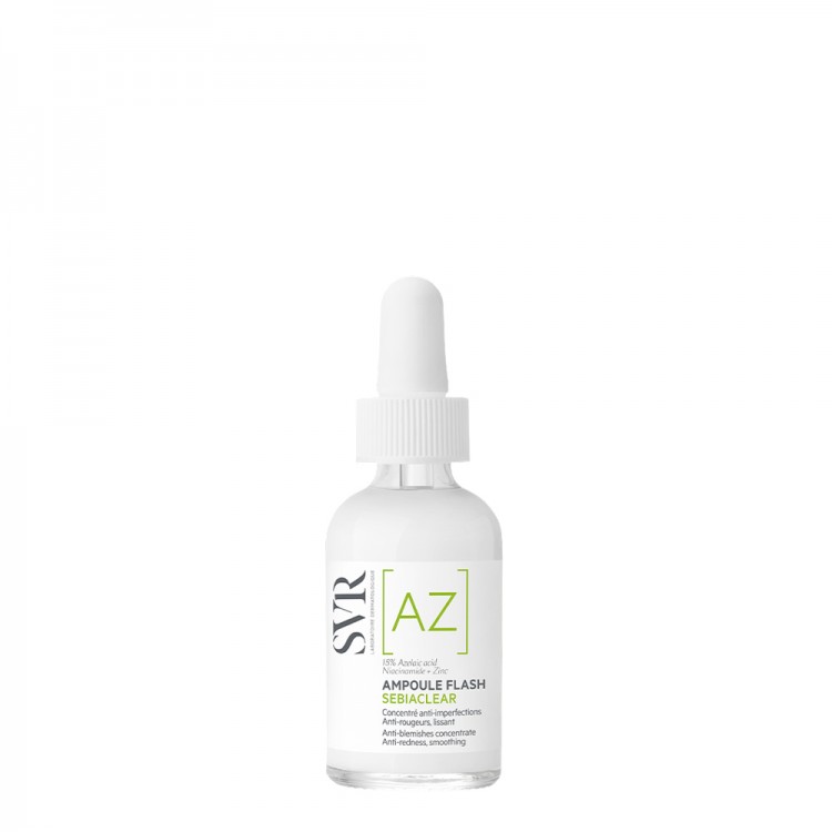 SVR Sebiaclear Ampoule Flash AZ Concentrado Anti-Imperfeições 30ml: mperfeições, vermelhidão e marcas. Adequado para utilizar a partir dos 10 anos de idade. Cuidado com 15% de ácido azelaico, ativo anti-inflamatório e queratolítico reconhecido. A ampoule