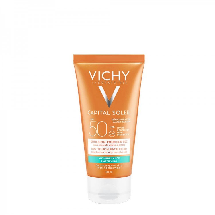 Vichy Capital Soleil Emulsão Anti-Brilho Toque Seco FPS50 50ml: Loção solar de alta proteção com efeito toque seco, duradoura e sem qualquer brilho. Para homens e mulheres de todo o tipo de pele, que procuram uma proteção solar que não deixe o rosto oleos