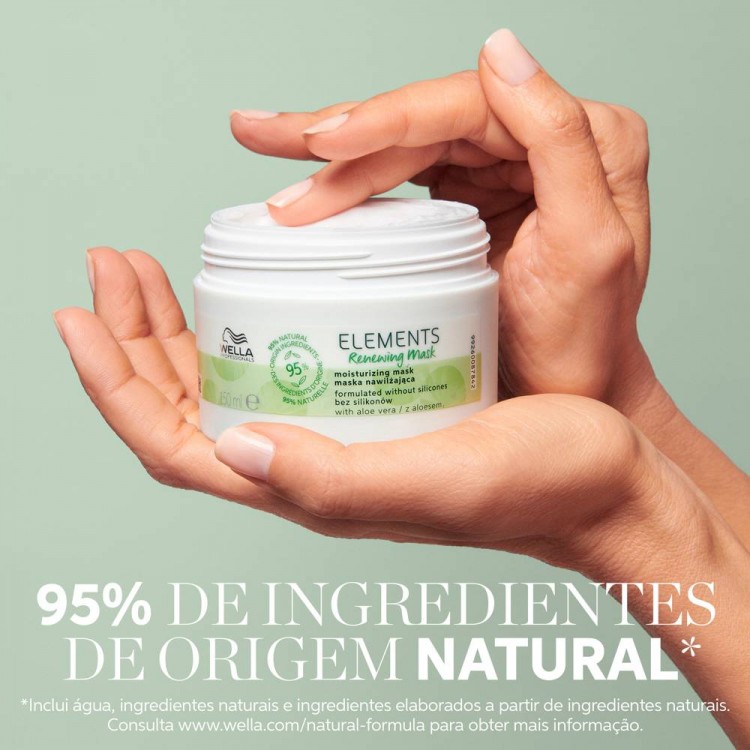 A máscara renovadora Elements é uma máscara de hidratação intensa, especificamente formulada sem silicones e com 95% de ingredientes de origem natural.