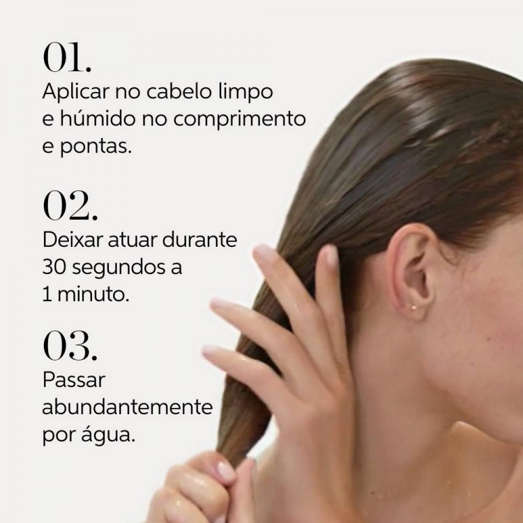 Como aplicarAplicar no cabelo limpo e húmido e distribuir uniformemente. Deixar atuar durante 3 minutos e, em seguida, passar abundantemente por água.
