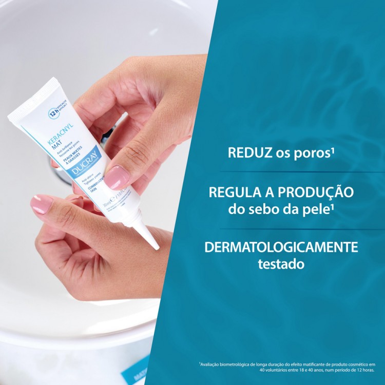 Ducray Keracnyl MAT Pele Mista a Oleosa matifica a pele oleosa. Neutraliza o brilho de forma imediata e duradoura, fechando os poros. Eficácia comprovada de 12 horas.