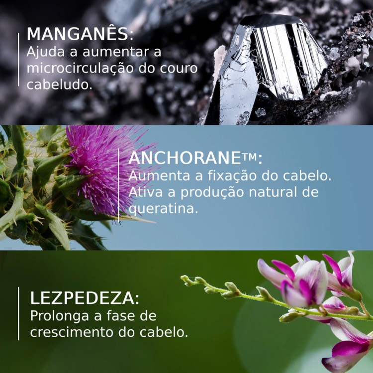 Mangalidone que, combinado com a massagem na aplicação, promove a microcirculação, a atividade metabólica e a ancoragem do cabelo ao couro cabeludo