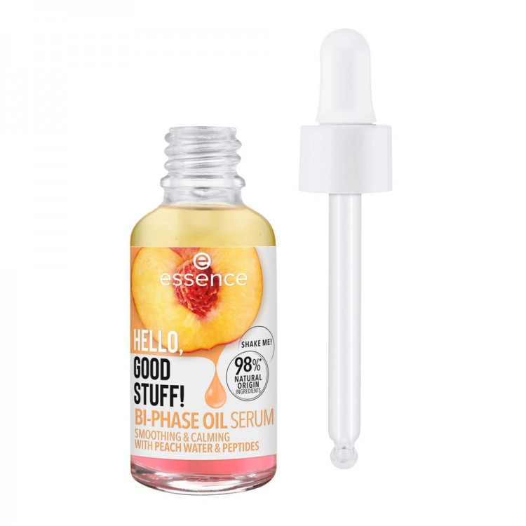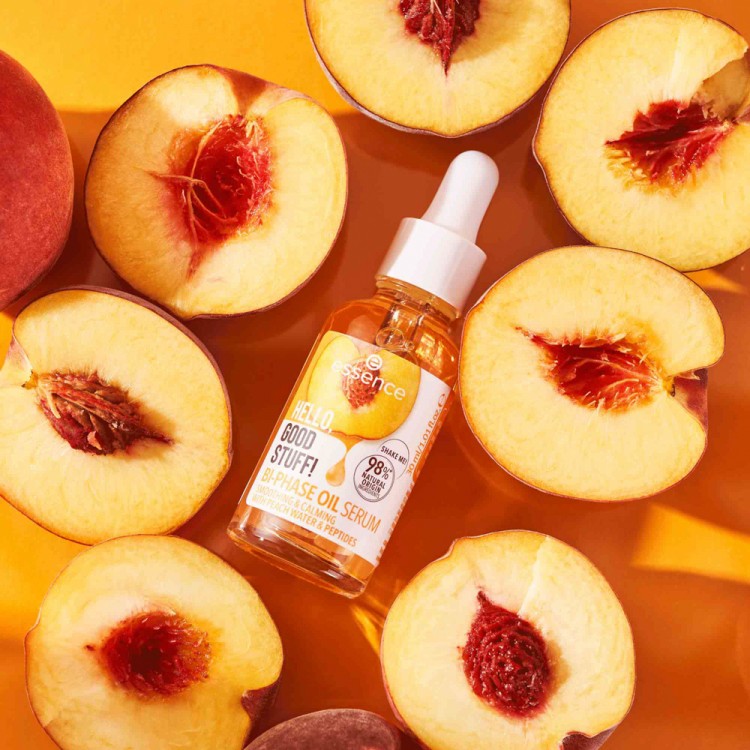 Essence Hello, Good Stuff! Sérum de Óleo Bifásico 30ml: O sérum de óleo bifásico não revigora apenas os sentidos com o seu aroma fresco a pêssego – também é muito divertido de usar: agita suavemente até que ambas as fases se misturem.