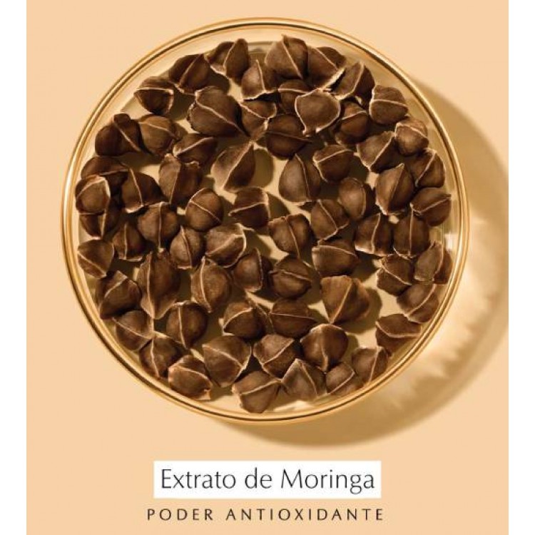 Extrato de Flores de Lavanda Marinha, Extrato de Moringa, Extrato de Células de Tronco de Cato e Ácido Hialurónico.