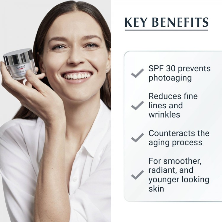 Eucerin Hyaluron-Filler Creme de Dia SPF30 é um creme anti-idade diário que combina ácido hialurónico e SPF30 para hidratar profundamente e proteger a pele dos danos causados pelo sol.
