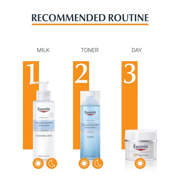 Massaje suavemente o produto na pele. Prossiga com Eucerin Q10 Active Contorno de Olhos. Espere cinco a dez minutos antes de aplicar a maquilhagem.