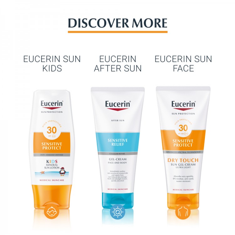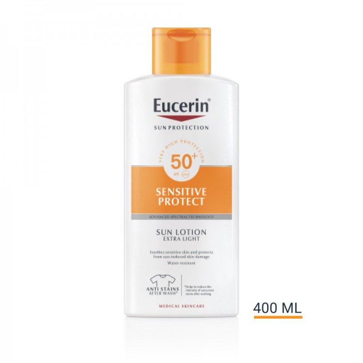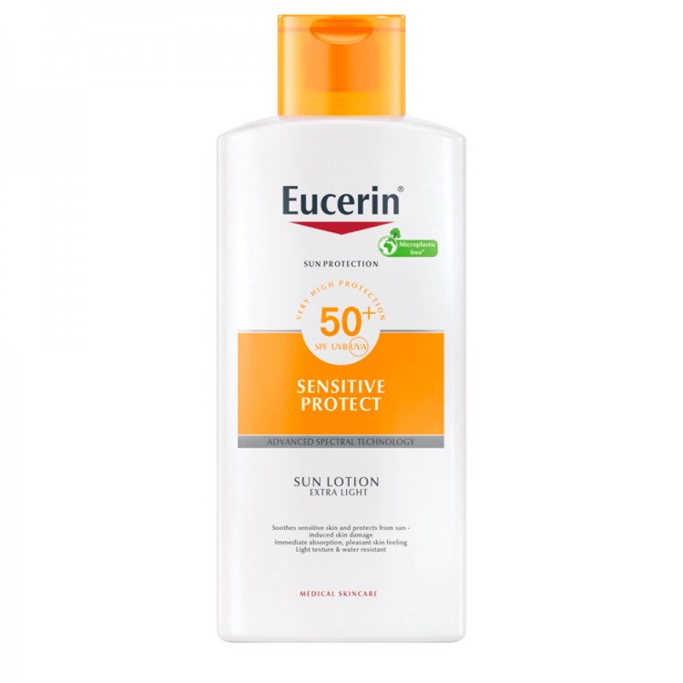 Como aplicar Eucerin Sensitive Protect Loção Solar Extra Light SPF50+ 400mlAplique generosamente antes da exposição solar e torne a aplicar com frequência, especialmente após nadar, usar a toalha e transpirar, para manter a proteção original. A quantidade insuficiente de protetor solar aplicado reduz o efeito de proteção.