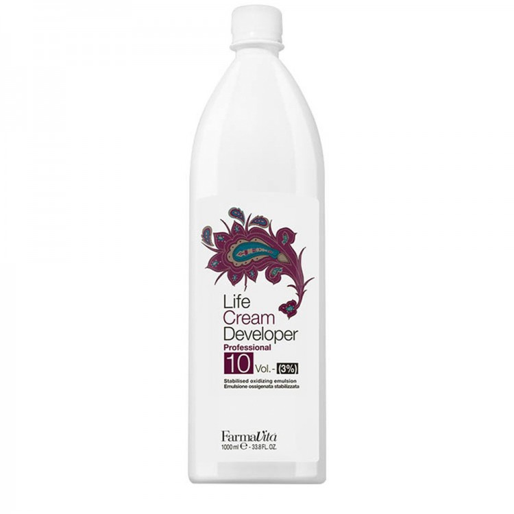 Misturar o Farmavita Life Cream Developer com a coloração ou pó descolorante na proporção recomendada – geralmente 1 parte de cor para 2 partes de oxidante (1:2) para reflexos ou clareamento.