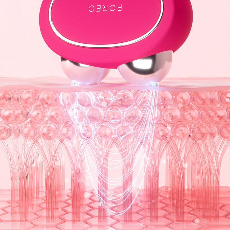 Pressionar levemente ambas as esferas metálicas no teu rosto, e deslizar o dispositivo lentamente nas tuas maçãs do rosto e na testa, à volta dos lábios e sobre o teu maxilar e pescoço, conforme preferência, com uma leve pressão.