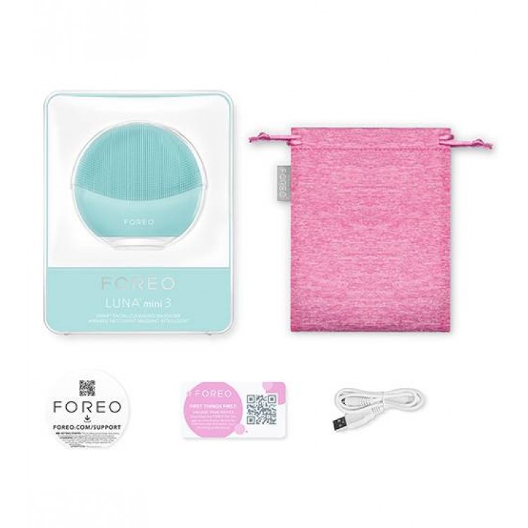 Como utilizar Foreo LUNA Mini 3 MintRemove toda a maquilhagem, humedece a pele e aplica a espuma de limpeza FOREO. Pressiona o botão central uma vez para o modo de limpeza ou pressiona rapidamente duas vezes para o modo Glow Boost. Limpa a pele com movimentos circulares nas bochechas e na testa e deslizando para cima e para baixo no nariz. Pressiona o botão durante 3 segundos para desligar o dispositivo. Enxagua e seca o rosto.